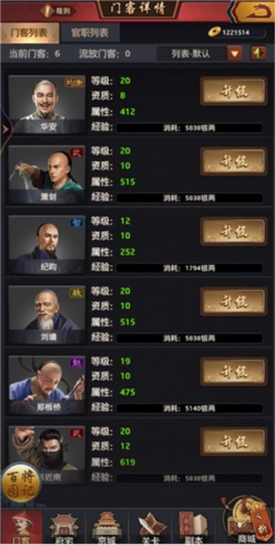培养门客肯定得给他们升级,要是门客没等级,就算资质技能再好也没用。升级门客得花不少银两,等级越高花的银两就越多,所以想培养新门客,得先准备些银两。