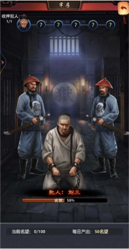 抓获的犯人能够在牢房里接受惩罚,每次惩罚会消耗10点名望,相应地可以得到粮食、金钱、各类丹药、提升好感与颜值的道具、元宝、强化卷轴等奖励。不同犯人的血量扣除情况存在差异,只有将当前犯人的血量打光,才能接着惩罚下一个犯人。并且每个犯人掉落的物品也各不相同,越靠后的犯人,掉落的物品品质越好。名望会在每天凌晨依据自身的每日产出量(这也和通关数量有关)进行增加,当天剩余的名望会保留下来,不过一旦达到上限就不会再增加了。