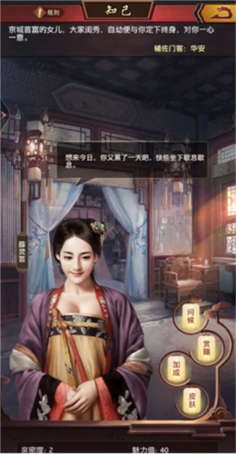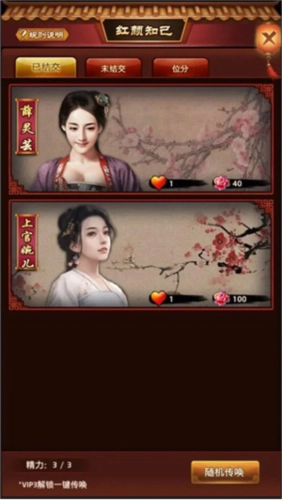 除了正妻之外,其他的红颜知己都需要通过寻访来随机触发,多与她们见几次面后,红颜便会对你倾心相付。