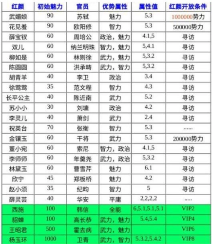 开区重点培养的门客决定了玩家需培养的红颜。依据VIP等级差异,v3之前培养金镶玉和干将;v3培养西施、韩信及以上;v4、v5、v6培养貂蝉、高长恭及以上;v7培养王昭君、霍去病及以上;v8培养杨玉环、卫青及以上。