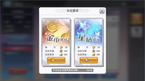 公会建设包含金币建设与星钻建设两种类型,选择星钻建设能够获取更多的体力以及公会贡献。