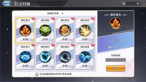 在公会技能界面,消耗指定数量的荷鲁斯之眼即可研习公会技能。公会技能总计8种,天选者能依据作战需求,针对性提升特定能力。