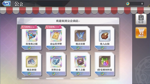 在公会信息界面中点击“商店”按钮,就能进入公会商店;消耗公会贡献,即可购买各类珍贵道具。
