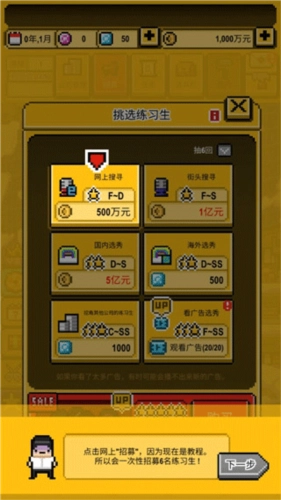 2、点击线上“招募”选项,由于当前处于教程环节,因此会一次性招募6名练习生。