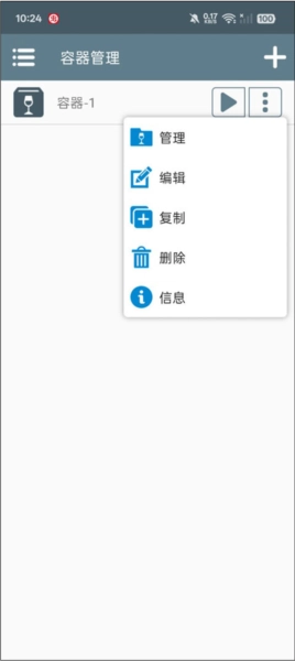 3、容器创建完成后,点击右侧的三点图标,选择“管理运行”选项进入设置界面