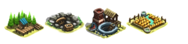 2、资源共分为木、石、铁、粮四种类型。其中,木由林场产出,石由石矿产出,铁由铁矿产出,粮由农田产出。