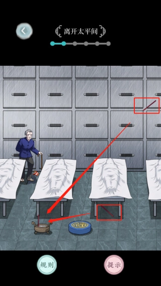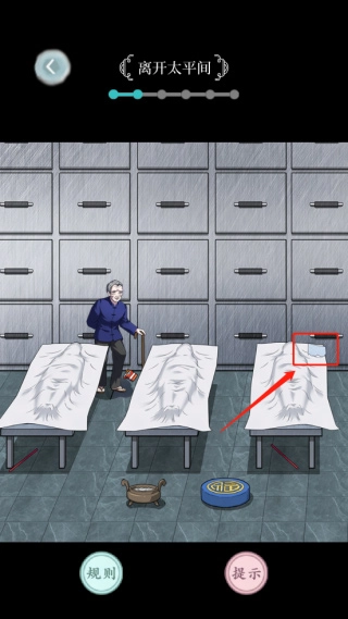 4、这时玩家可能会进入太平间,在这个场景里,玩家可以点击图中绿色箭头指向的那张纸条。