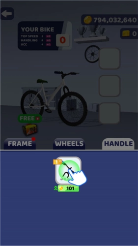 6、在车库界面,点击手柄就能更换新的自行车手柄,车架也可以一并更换。