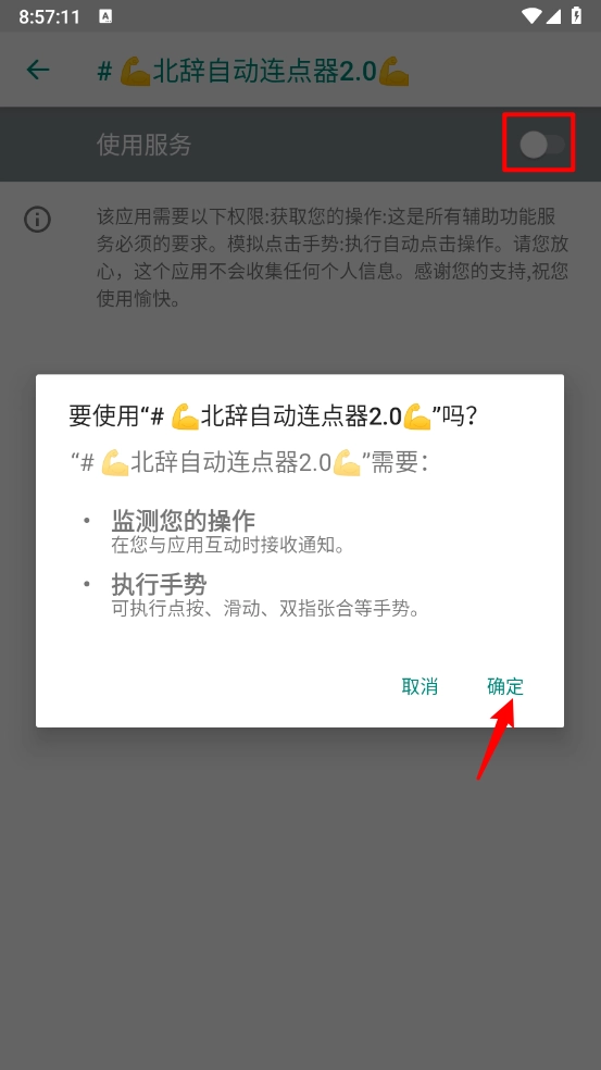 3、进入跳转后的无障碍设置页面,找到「北辞自动连点器2.0」的权限开关并开启。