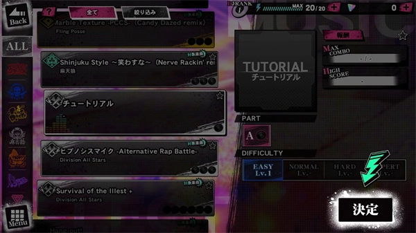 在玩法设计上,该作延续了多数“下落式音游”的核心机制,同时融入嘻哈风格的电子音乐元素,整体界面呈现出类似打碟机的视觉效果。与其他音游侧重展示人物或偶像演出的方式不同,《催眠麦克风》通过随音乐节奏动态呈现的涂鸦画面、人物立绘等元素,强化了玩家在演奏过程中的代入感,并进一步渲染了游戏氛围。