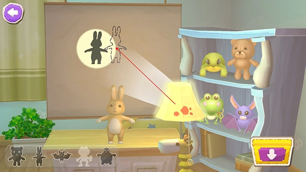 收集到小兔子后,就能点击墙后的照片进行影子对照啦。需要宝宝把台灯照出的影子对准后面的虚线,这样它们就会跳舞,在这个过程里还能收集到青蛙影子呢!