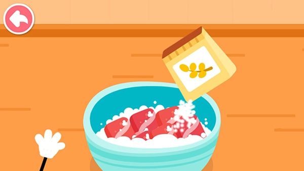 4、开始做菜后,小厨具会自动开火,宝宝只需把调料和食材倒进去就可以了。