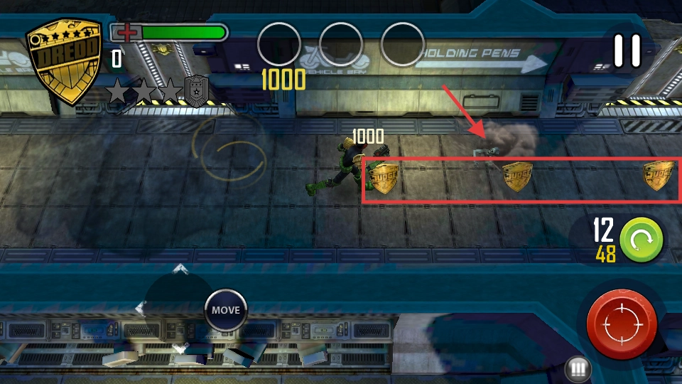 3、把角色移动到【1000】分的区域,拾取冒烟的道具和【JUSTICE-SHIELD】,这样能快速提高当前分数。