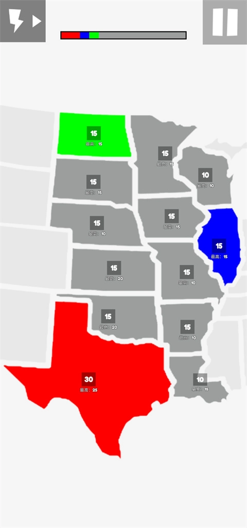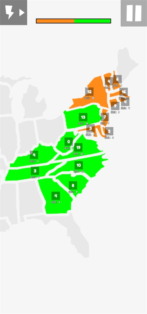 地图战争是一款超有趣的战争策略游戏,现已支持中文,而且在原作的基础上新增了不少地图与关卡,能让玩家拥有更棒的体验。这款游戏玩法很简单,玩家初始拥有25个点数,得用这些点数去占领灰色区域。举个例子,要是某个灰色地区有10个点数,玩家就得从自己的25个点数里分出10个来占领它,这样自己剩下15个点数,该灰色地区就变成了玩家的地盘。占领成功后,这个地区会持续产出相应的点数,每个地区都有最高点数限制,后续点数会增长到这个上限,直到把对手的所有位置都占领,玩家就能取得胜利。