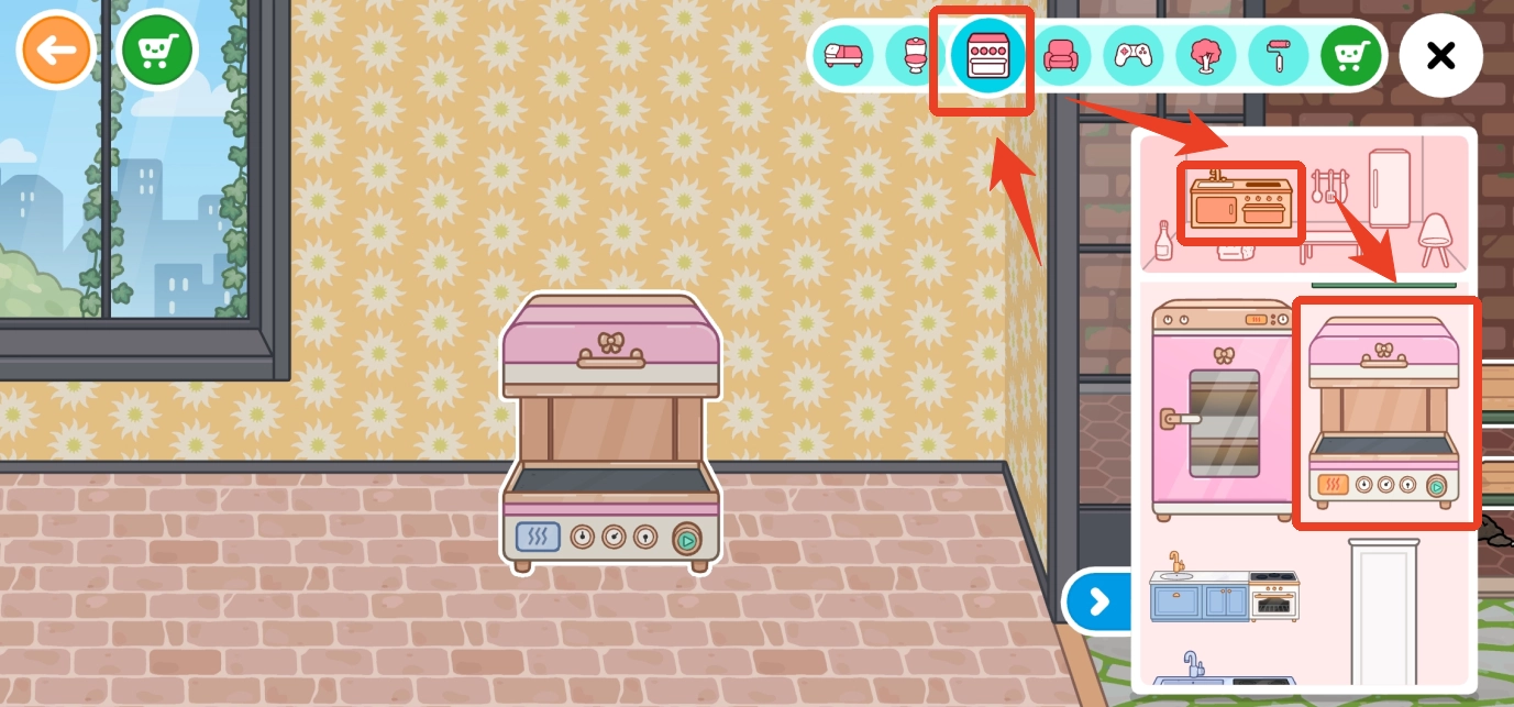 1、首先我们来到自建房,点击厨房用品里的这个台子,找到这个类似烤箱的机器并将其放置在房间里。