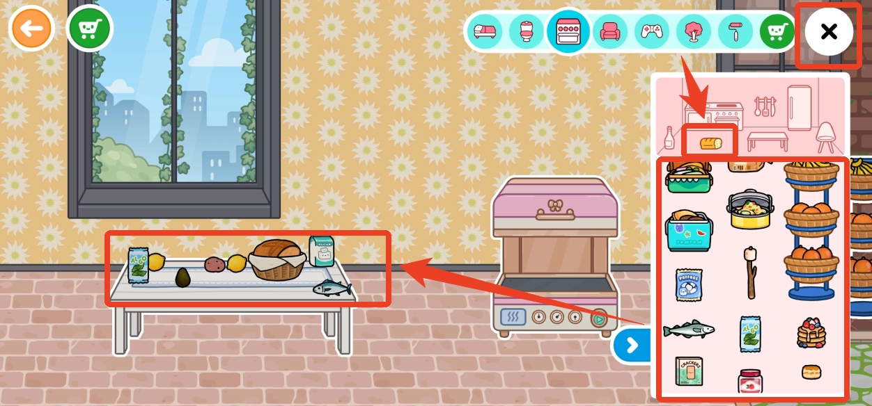 2、接下来,点击上方的面包图标,挑选一些可二次加工的食材,比如水果、蔬菜或面包等,将它们摆放在桌面上。摆放完毕后,点击右上角的×按钮。