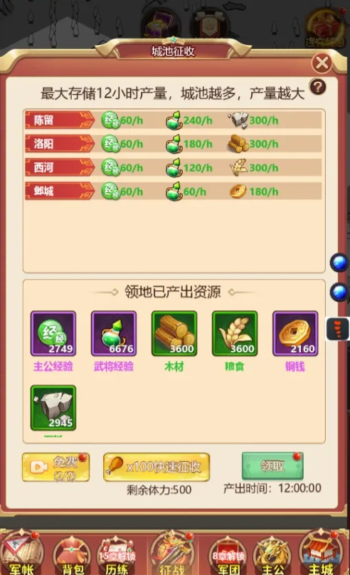核心资源产出地,通关能拿主公 / 武将经验、铜币,还有木、铁、石、粮四大基础资源。