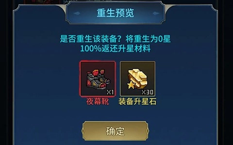 1、如果升过星的装备不再需要,那就果断选择重生,之前升星所消耗的材料会100%返还,没有任何损耗,用起来特别方便。