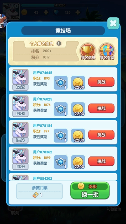 2、竞技场取胜攻略:开蛋时除了能得到金币,还有机会随机获得竞技场挑战券。拥有挑战券后,就能和其他训练家展开对战!获胜后可领取金币与积分奖励,积分越高,遇到的对手实力越强,金币奖励也会更丰厚!正如“风浪越大,鱼越贵”,挑战越强收获越丰!