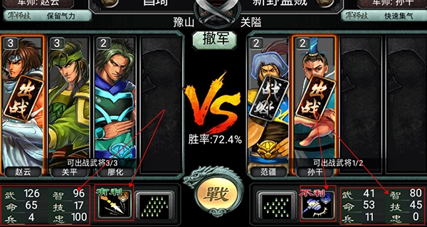 选择武将的出战顺序至关重要,出征前务必将生命值、技能值和士兵数量补至满额。尽量搭配不同兵种的武将,优先让能克制敌军的兵种先发。己方的高级武将则应留作关键节点,用于对抗敌方的高级将领。