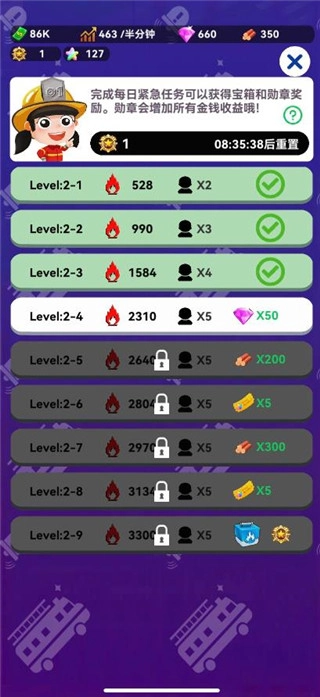 5、需通关最后一关方可获得勋章,累积勋章能显著提高金钱收益,不过勋章也会增加次日的任务难度;