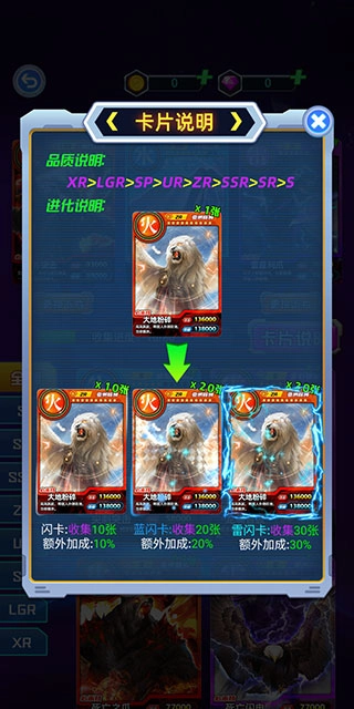 6、卡片品质由高到低依次为XR、LGR、SP、UR、ZR、SSR、SR、S,并且所有品质的卡片均支持进化。