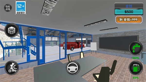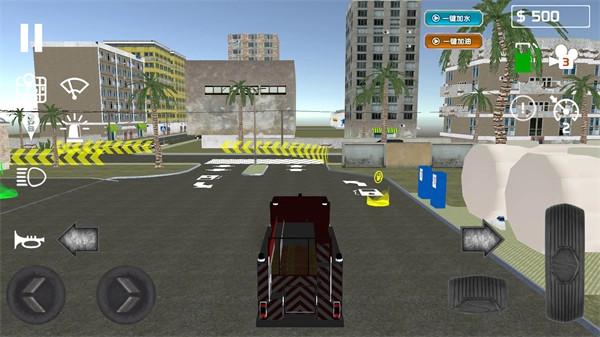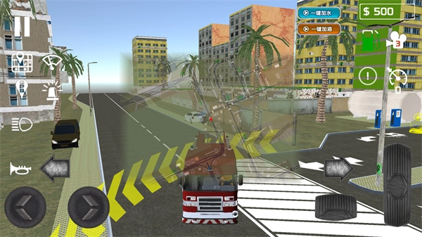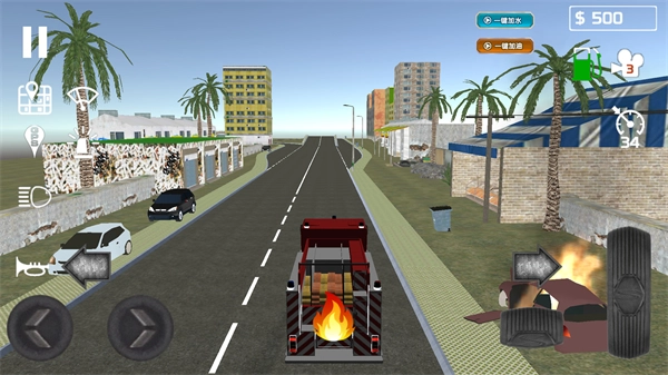 1、点击主界面中央的方向盘按钮,即可启动消防车并承接各类灭火任务。