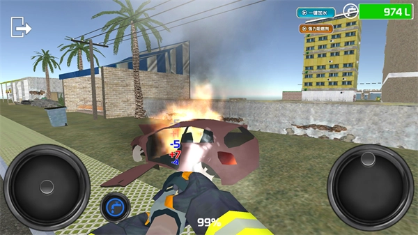 5、点击下方的水龙头小按钮,水枪就会开始出水,你需要用摇杆控制方向,对准着火点来灭火。
