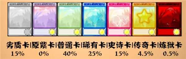 5、卡牌品质由低到高依次为:劣质卡(15%)、原紫卡(0%)、普通卡(40%)、稀有卡(25%)、史诗卡(15%)、传奇卡(4.5%)、炼狱卡(0.5%)。