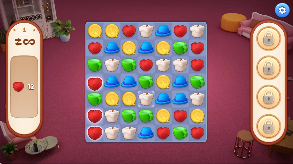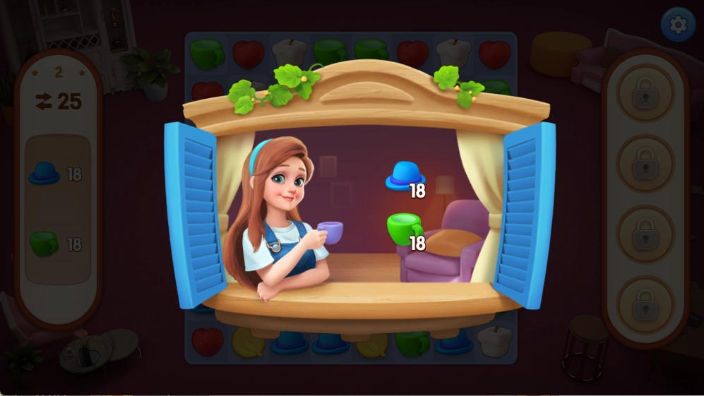 1、核心玩法是完成三消关卡,通过通关来获取金币和装修材料,进而逐步完成房屋的装饰与翻新。