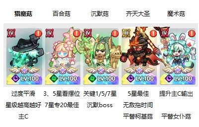 ①培养优先级排序:猎魔菇排在首位,其次是7星的百合菇,接着是5星的齐天大圣,然后是沉默菇,最后是魔术菇。