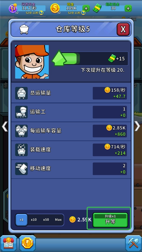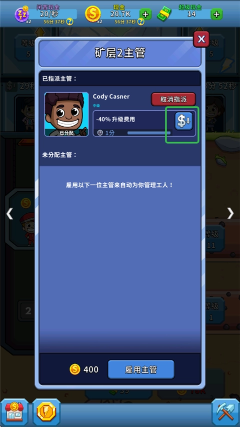 5、经理人体系引入 当达到特定等级后,玩家可雇佣矿区、电梯与地面经理。这些经理不仅能监督工人自动作业,还拥有专属的加速技能,可有效提升整体运营效率。