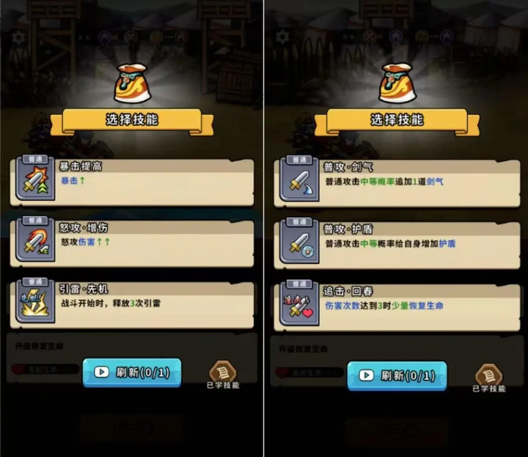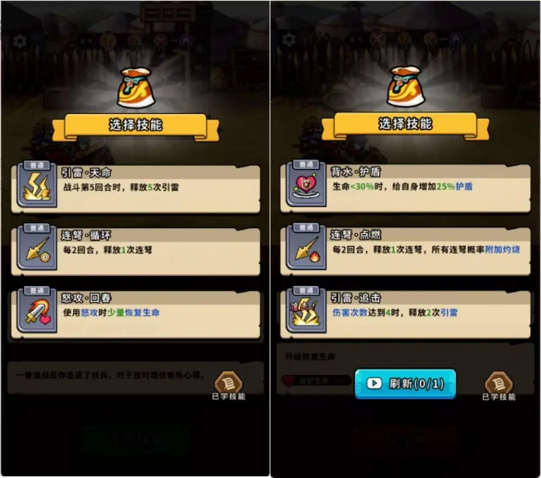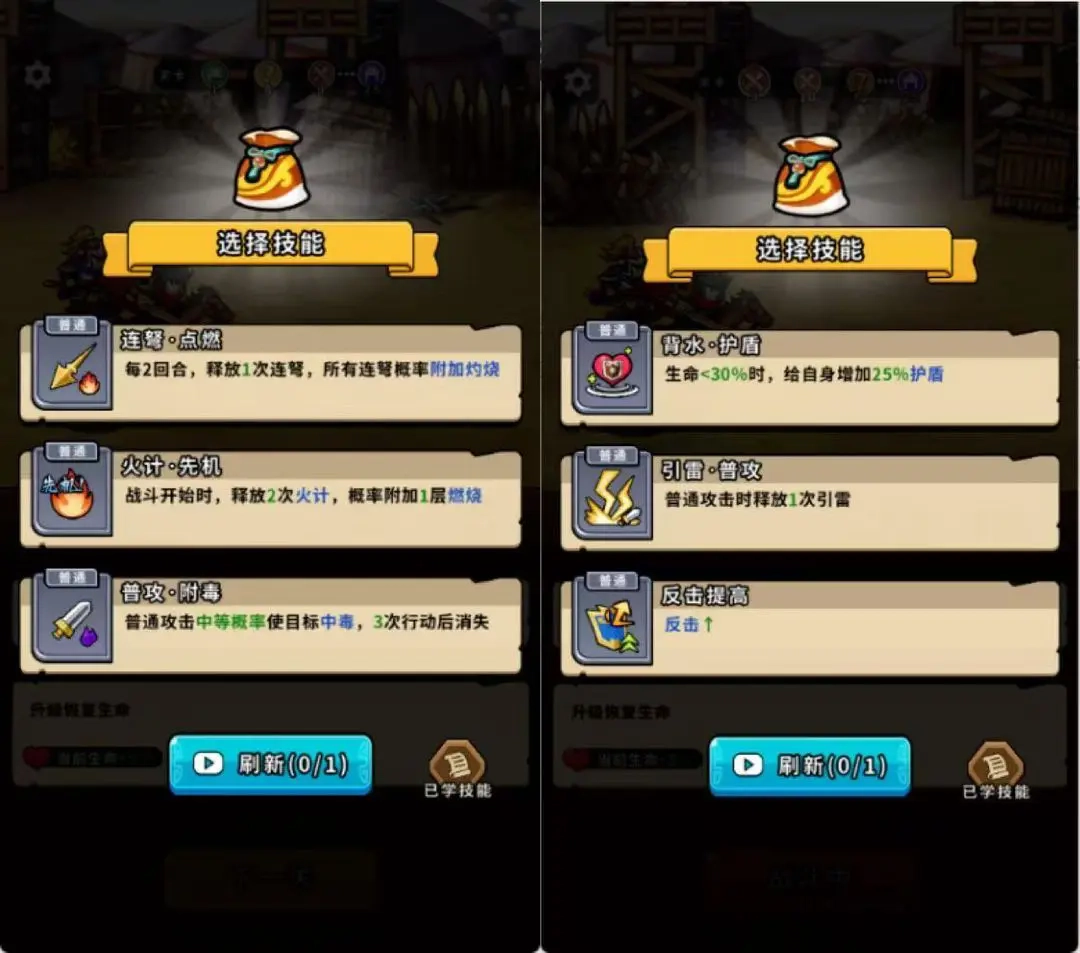 当三个技能都涉及概率时,既可以通过看广告来刷新技能,也能选择带有概率属性的技能,但尽量不要选那种3次行动后就会消失的技能——哪怕它的概率数值更高,可毕竟是游戏初期,只用它来打小兵实在太浪费了。这种情况下,选择释放两次火计会更合适。