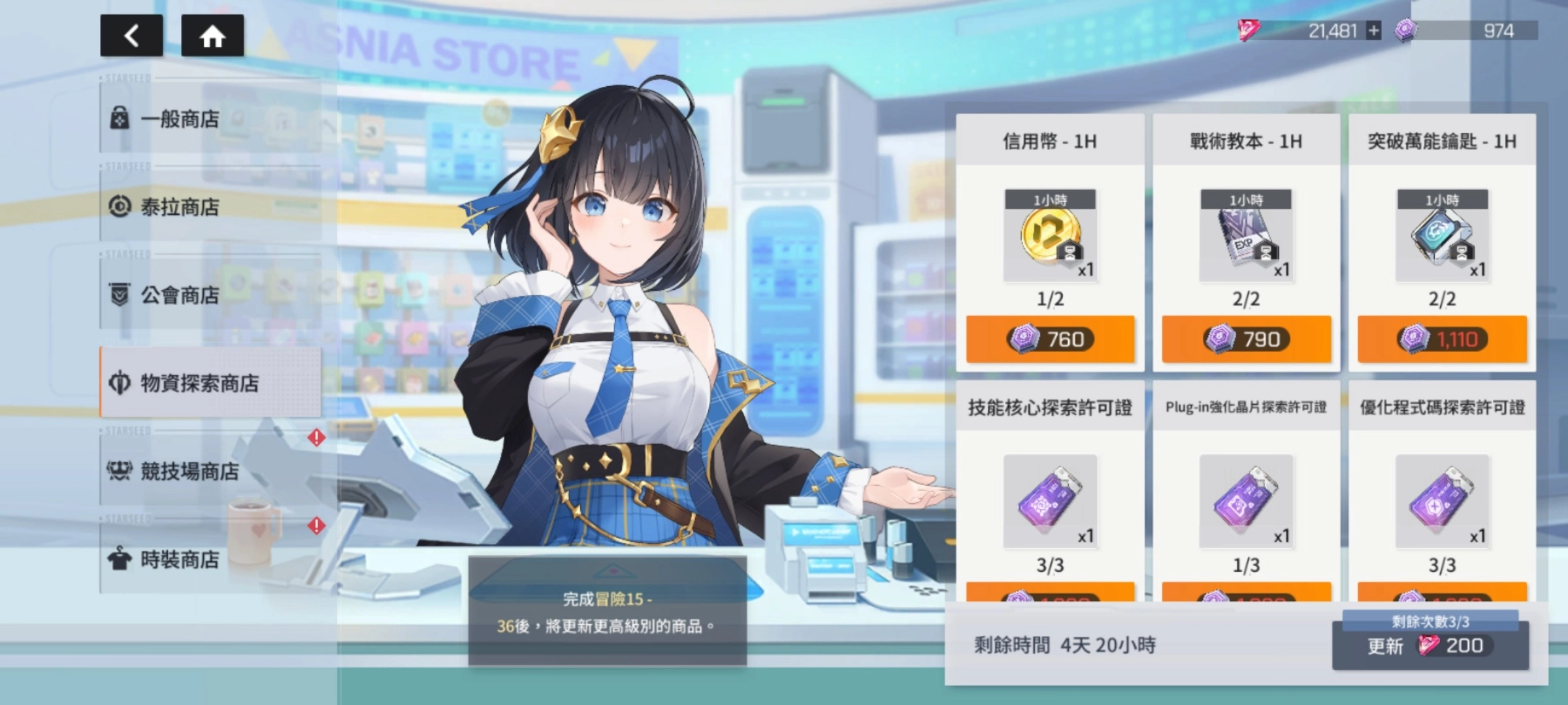优先购买技能-插件强化许可证(也就是材料本的门票),如果数量足够的话就把4种门票都买了;要是到了后期资源非常充足的阶段,连前三个材料也可以一起购入。