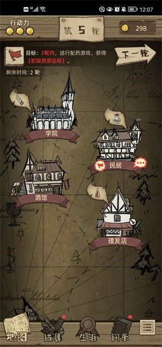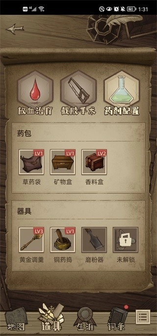 首先是地图上的地点,理发店对应放血治疗,民居对应药品配置,学院对应截肢手术,酒馆对应人际交互。要是地图上还没显示这些地点,说明剧情尚未推进,等推进后就能解锁。