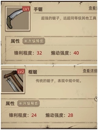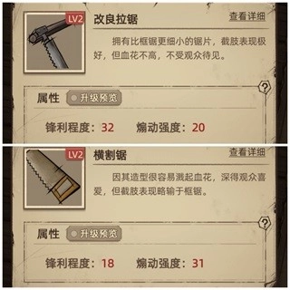 改良拉锯与横割锯的侧重点有所不同,不过截肢手术通常安排在最后进行,医师完全可以先用初始的框锯应付,之后直接换用手锯。不难发现,一级手锯的各项数值已经远远超过其他三种工具的二级版本了。