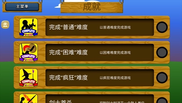 完成“普通”难度:以普通难度通关;完成“困难”难度:以困难难度通关;完成“疯狂”难度:以疯狂难度通关;剑士首杀:操控剑士消灭首个敌人单位;弓箭手首杀:操控弓箭手消灭首个敌人单位;矛士首杀:操控矛士消灭首个敌人单位;法师首杀:操控法师消灭首个敌人单位;巨人首杀:操控巨人消灭首个敌人单位;背后伤害:从目标背后造成伤害;投掷长矛:操控矛士时投掷长矛;利剑之跃:发动剑士的跳跃攻击……还有更多成就等待你解锁。