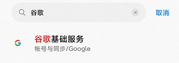 1、首先打开系统设置,输入【谷歌】/【Google】等关键词搜索,找到【谷歌基础服务】选项并进入。