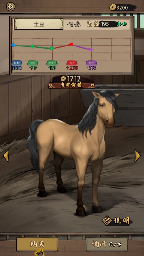 2、购买跑马前,需先点击右侧箭头调整马匹身上的污点并询问降价。例如,点击马匹臀部的印记,再选择右下角的“询问”按钮,就能将价格降至对应水平。你总共有4次降价询问的机会,要好好把握,争取以最低价购得这匹宝马。