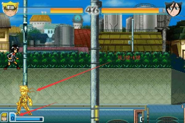 4、当能量积累到3格满值后,同时按下J键与K键,就能变身为金色鸣人形态。