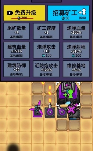 2、成功安家后,点击基地会弹出建造面板。在这个面板里,你既可以选择升级基地,也能提升矿工的采集速度、增加炮弹和建筑物的血量;另外,通过增速功能还能提升持续输出能力,但解锁这一功能的前提是基地必须先完成升级。