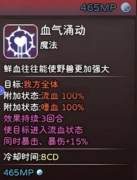 (2)巨浪潮蟹:作为C位必带的蓄力型技能,用少量血量消耗换取下一次行动时的高额爆发输出,搭配后续会介绍的“兴奋”效果,能打出极为可观的爆发伤害,是队伍中不可或缺的必带技能。