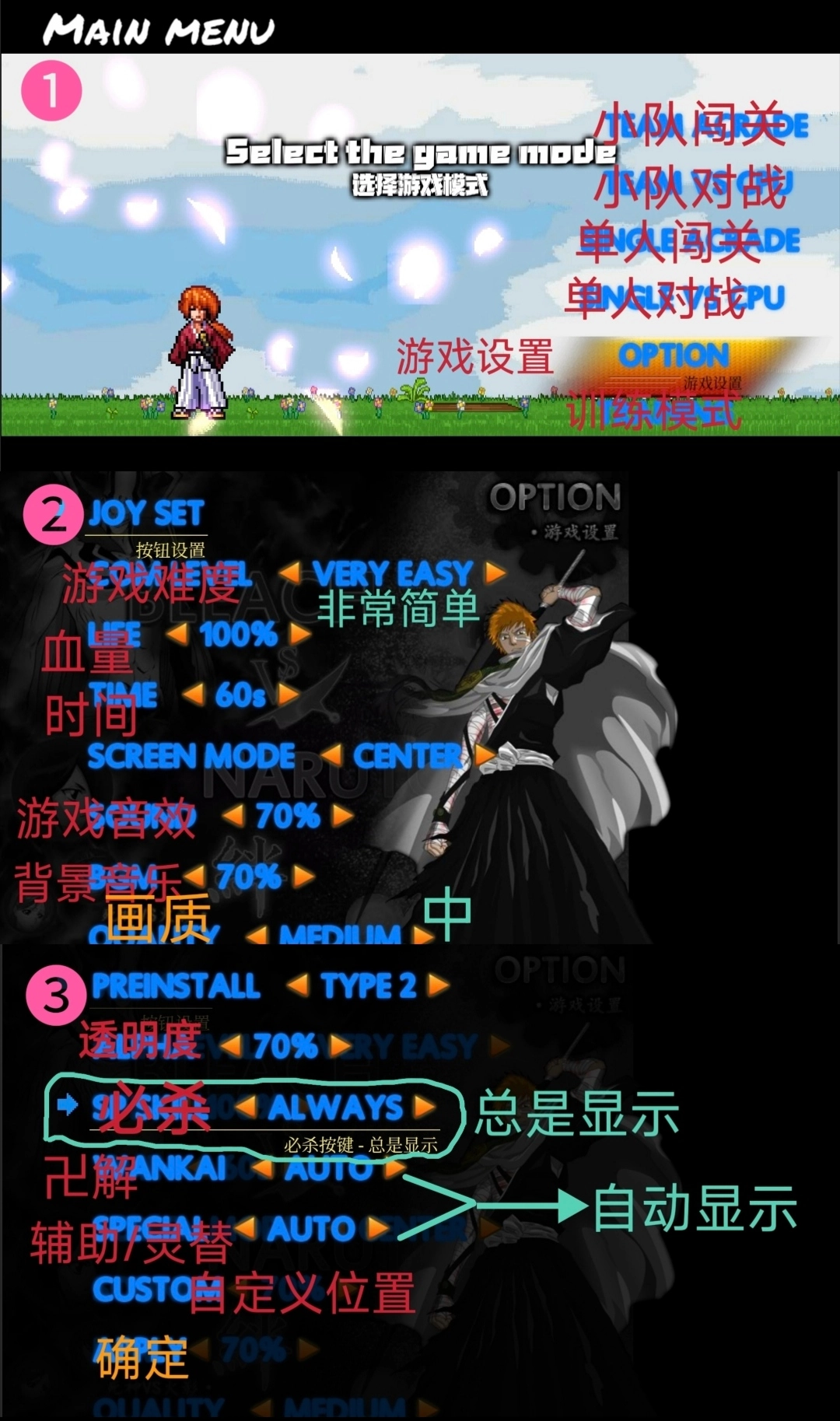 2、字体显示问题:系统版本12及以上无法正常显示字体,因此相关翻译内容已标注在图1中。建议开启图中画圈的选项,这样能更方便部分人物释放技能。