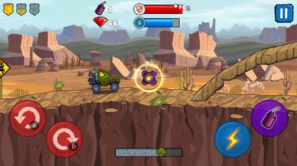 这个玩法其实挺简单的,左边主要用来控制赛车的重心,右边则以加速和释放炸弹为主。关卡里还设计了各种各样的障碍和道路,让每一关都独具特色。