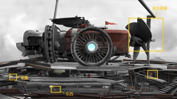图里被高亮标注的是机关,呈现橙红色,所有图中的机关都是这个颜色。由于人只能操控前后移动和跳跃动作,所以按钮的操作方式基本就是顶、踩、推这几种。能量液是用来驱动后面的房车(帆车)的。能量液不直接叫燃料,因为它之后还能用来灭火,叫燃料的话会有点违和。