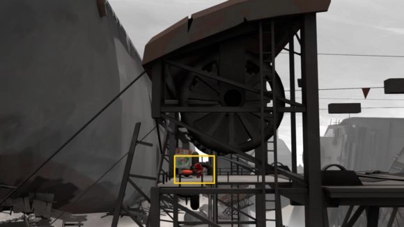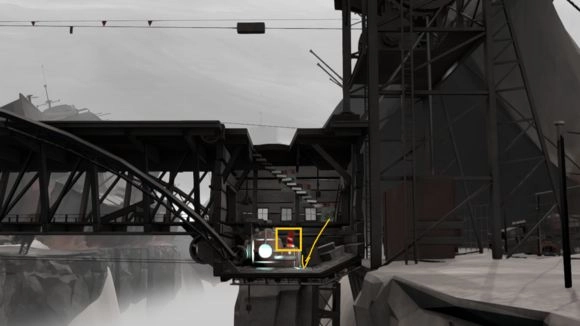 6、整体没什么难度,下车后一直往前走,到达桥的另一头,在这里把那个油桶放到箭头指示的位置,按下开关就可以了。