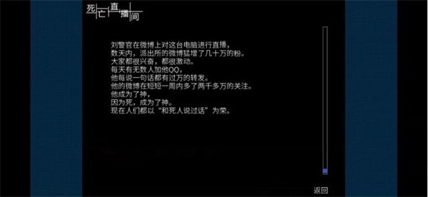 《死亡直播间》是一款剧情层层推进的视觉文字类作品。在这个故事里,玩家将扮演名叫陈默的年轻人——他凭借自身的特殊能力,通过直播维持生计。陈默能潜入不同人的身体,亲身体验各式各样的死亡方式;他开设“死亡直播间”,定期向粉丝讲述这些独特的经历。作品针对微博的现状进行了辛辣讽刺,能让你接触到多元的价值观,获得沉浸式的体验,还能不断解锁特殊奖励。