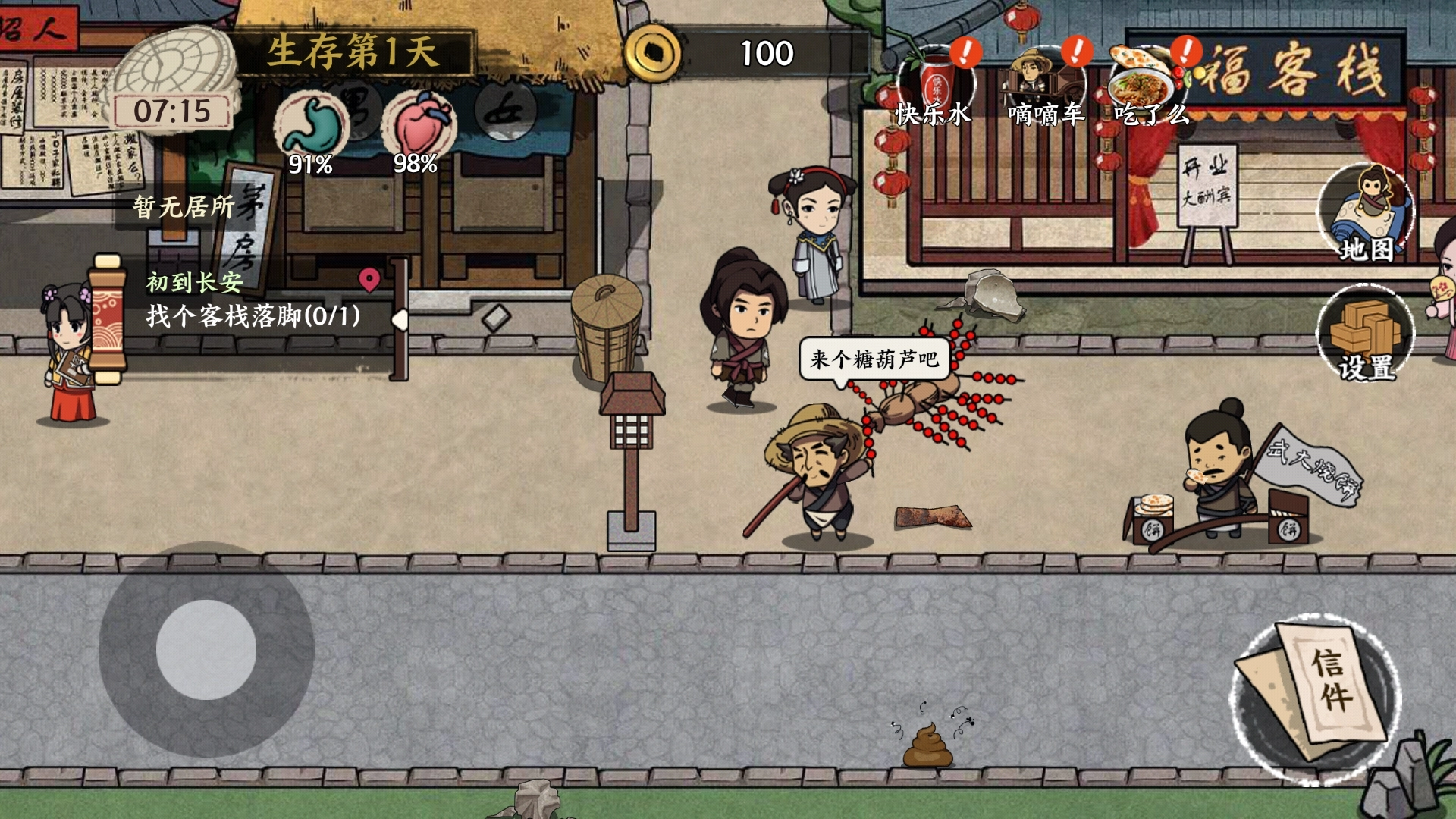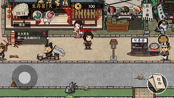 1、首先进入的依然是大家比较熟悉的新手教程,建议不要怕麻烦选择跳过——完成新手任务能获得少量金钱,虽然不多,但足够支撑我们在唐朝前期生活一周。前期的赚钱方式和打工模拟器类似,种类较少,且大多是耗时的体力活。像刷马桶这类工作不太推荐,它会大幅降低健康值,健康值过低还得花钱看病,反而得不偿失。