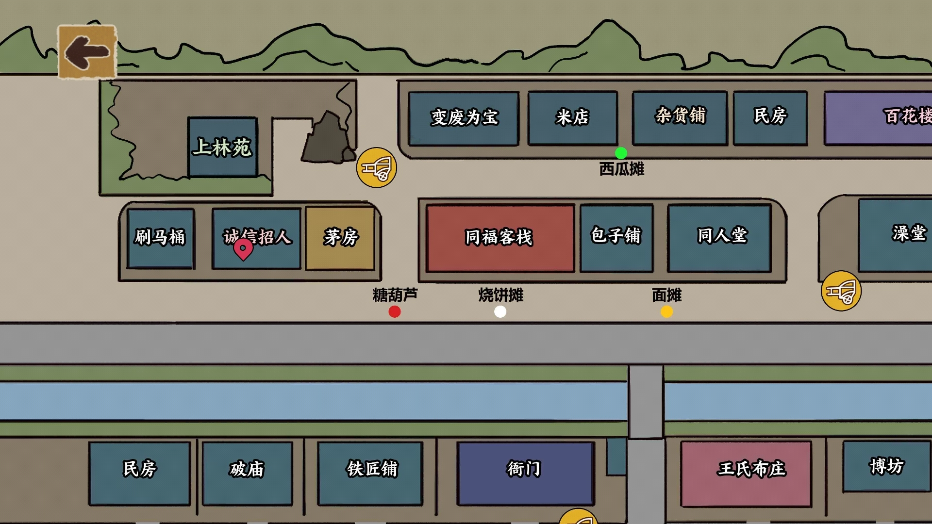 6、进入地图界面后,能看到自己当前的位置,以及界面里各个场景和摊子的具体地址。