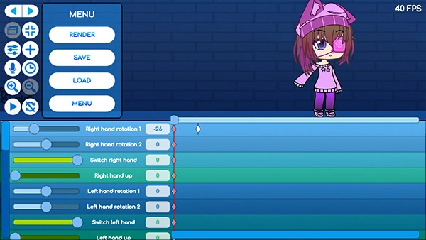 3、完成操作后进入动画编辑界面,左下方是角色动作区域,借助文字左侧的滑钮就能调整上方角色的动作;右侧则是时间轴,需要调整动作,让它在右侧时间轴里生成一个新区域,并且在这个时间段内进行移动。